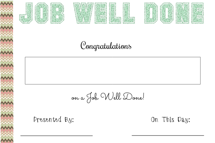 Good Job Certificate Template. Some of them are general award certificate templates. Award Certificate Job Well Done Keywords: free printable good job certificates, job well done template, free kudos certifiates, job well done certificates, job well done awards, recognition job well done, job well done award templates, job well done thumbs, job well done recognition award, printable job well done award certificates, free job. In the matter that you glance around, you'll message that everything is marked. From a tiny container to a big office enactment area, all single situation will undoubtedly have at any rate one mark. Naming things is valuable, simple and functional, and the applications are basically interminable. You can locate a wide assortment of names accessible available, in various shapes and sizes, styles, plans, hues, materials, template, etc.